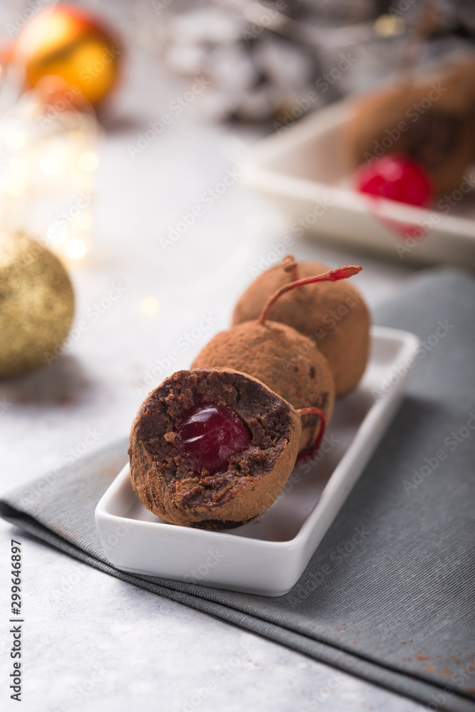 Christmas Sweet Candies On The Dessert Table Chocolate Balls Of Biscuit With Cherry Loli Pop Or Cake Pop New Year Decoration And Apple Cider Drink Happy Holidey Concept Stock Photo